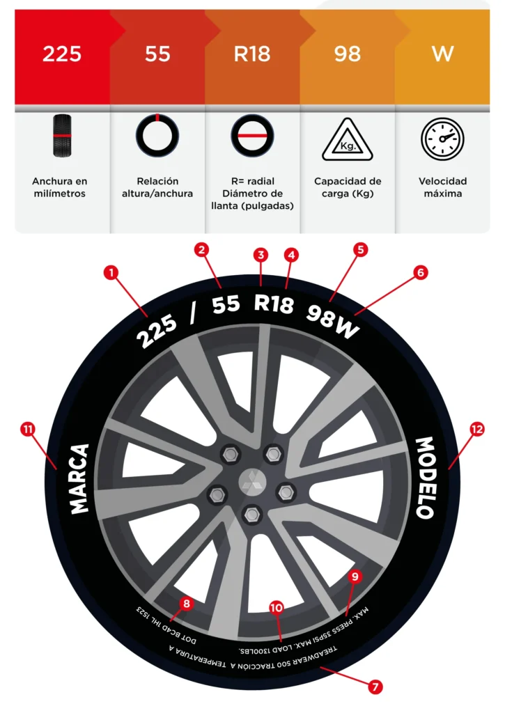 10. Límite de carga. Muestra en libras el peso máximo que soporta la llanta.