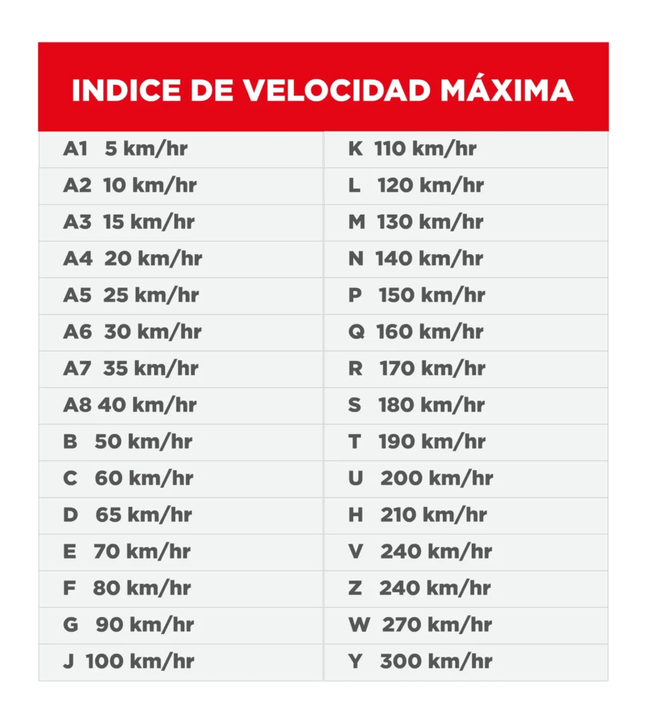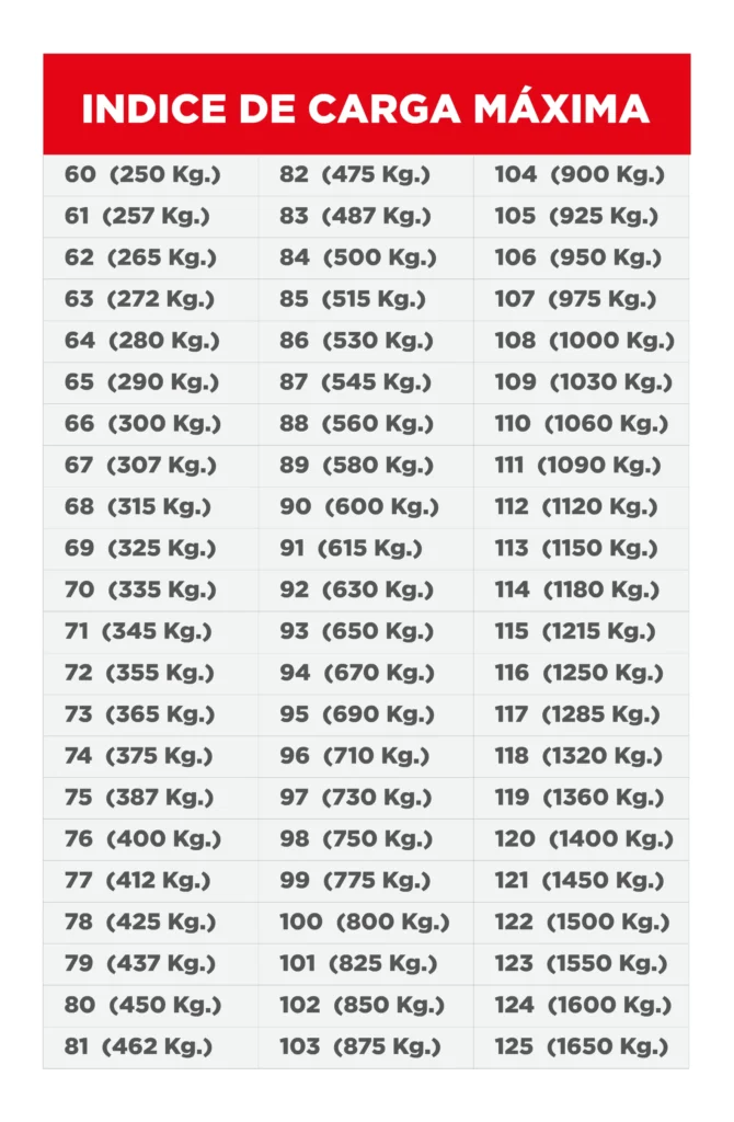 5. Índice de carga: 98. Es un código numérico que indica la capacidad de peso máximo que tiene cada llanta. Entre mayor sea el índice de carga de la llanta, mayor será su capacidad de carga.